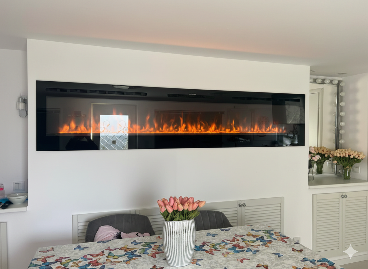 Камин длиной составляет более 2.5 метров! Не смотря на свои размеры он потребляет столько же электроэнергии, что и представители меньших размеров. Цвет пламени можно регулировать по желанию и настроению клиента, так же как и яркость. Комбинация из кристаллов и тлеющих поленьев поражает своим изяществом и красотой!